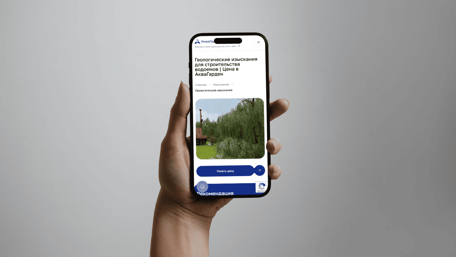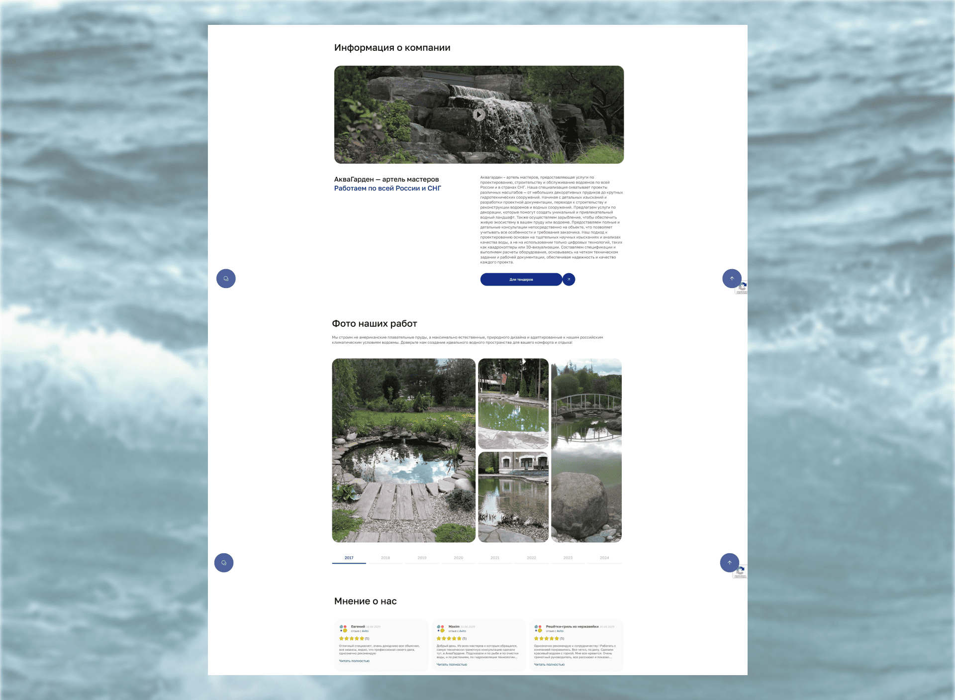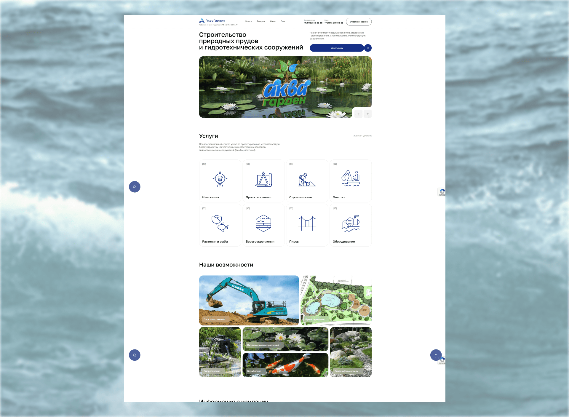 Выявили ключевые задачи: показать комплексный спектр услуг — от изысканий до комплексного обустройства водоёмов, чётко и наглядно; улучшить навигацию и визуальную подачу; построить доверие через портфолио и примеры.
