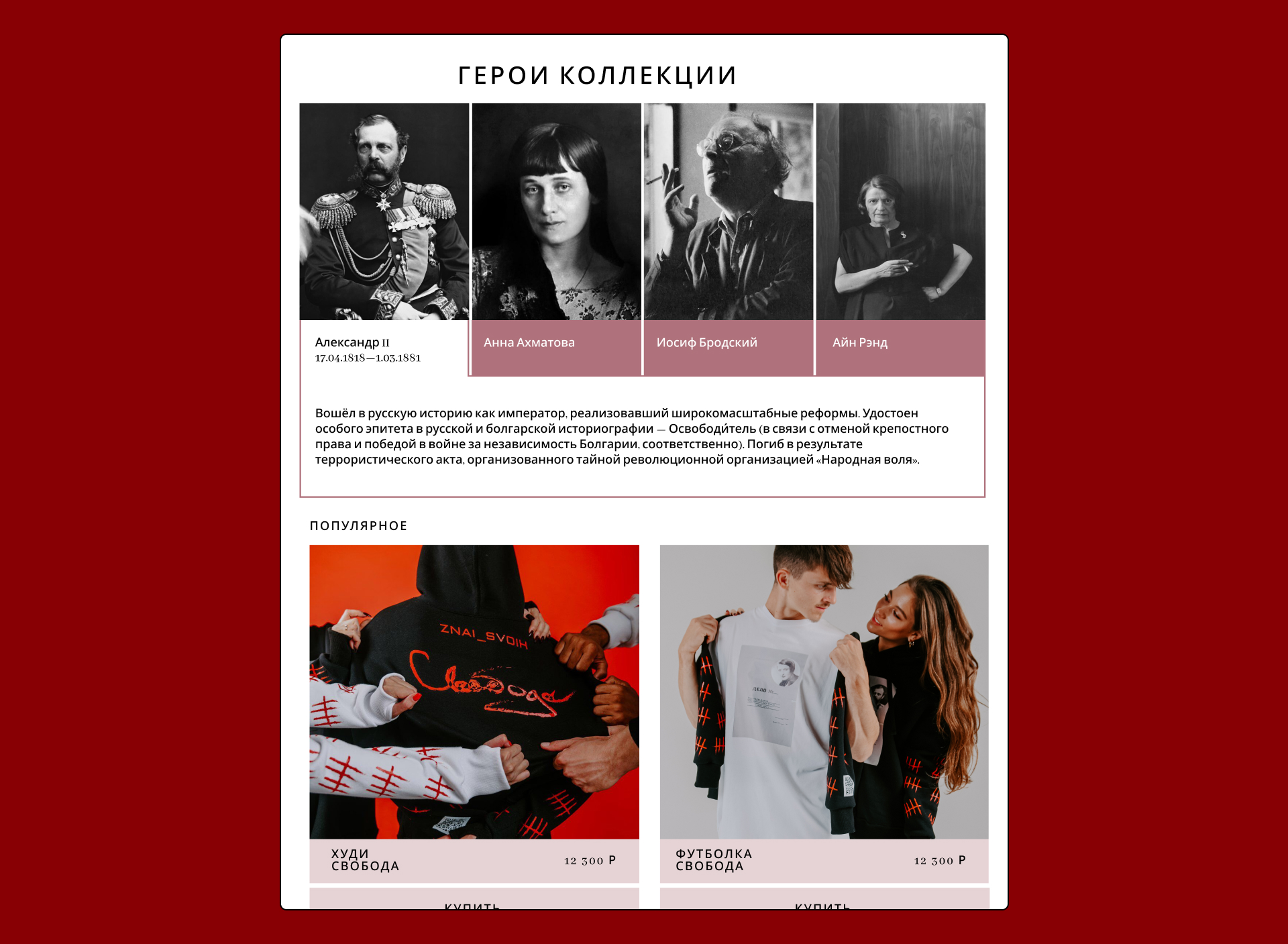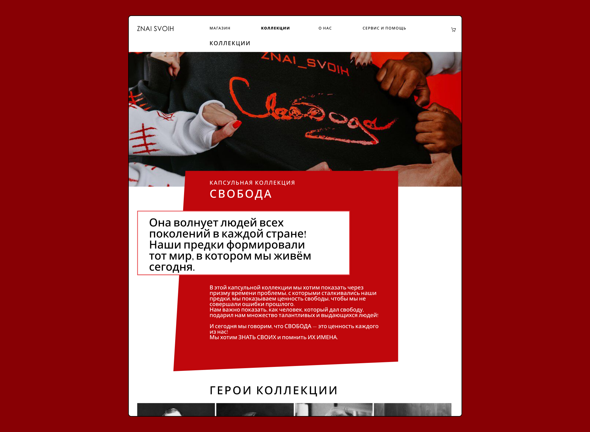 Сайт отражает философию бренда - помнить, знать и ценить Великих Людей, соединяя смысл и современный формат fashion-проекта.
