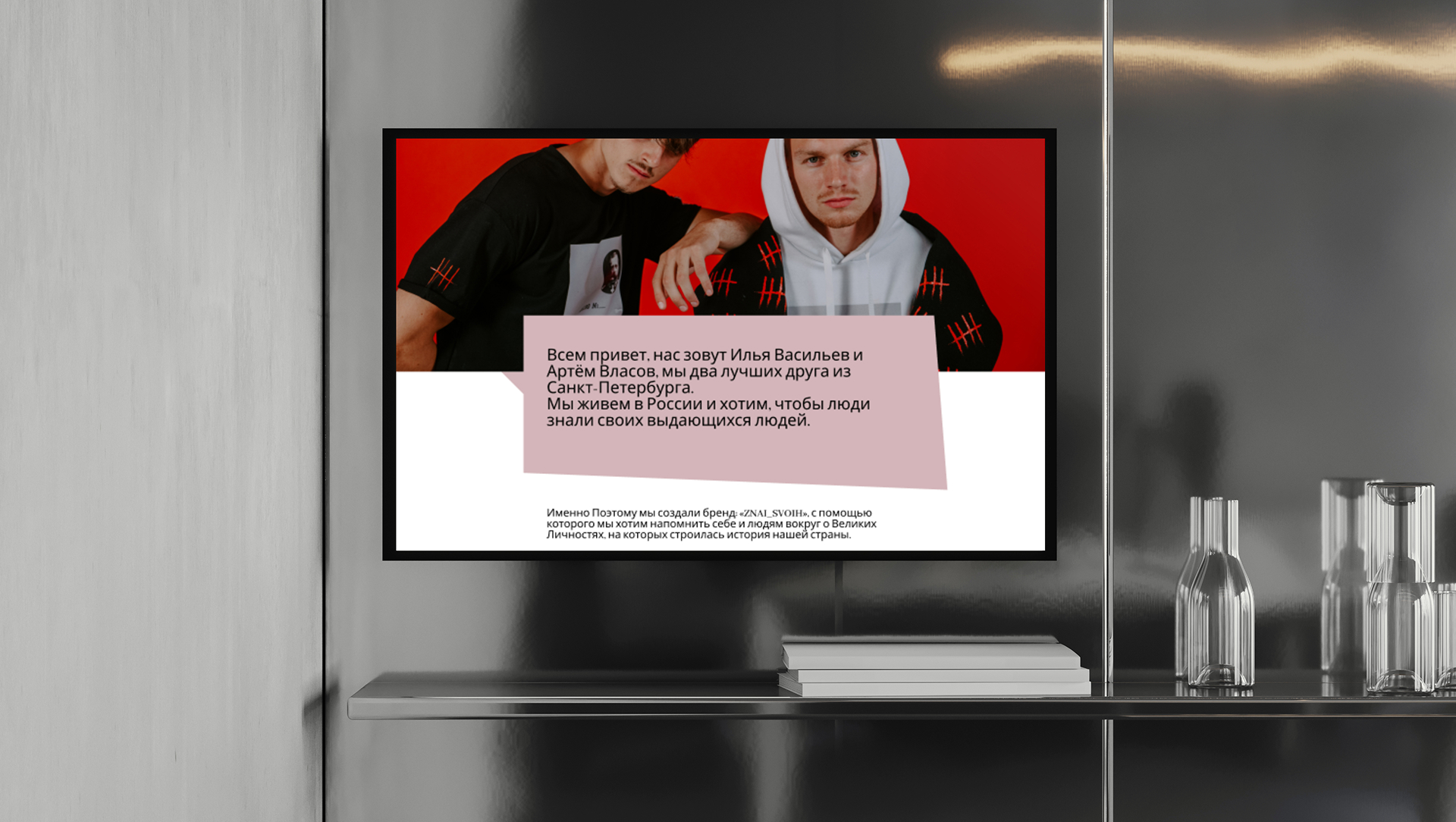 К нам обратился бренд ZNAI_SVOIH - марка одежды из Санкт-Петербурга, созданная Ильёй Васильевым и Артёмом Власовым. Бренд посвящён выдающимся личностям России и через дизайн транслирует идею памяти, уважения к истории и культурной идентичности.