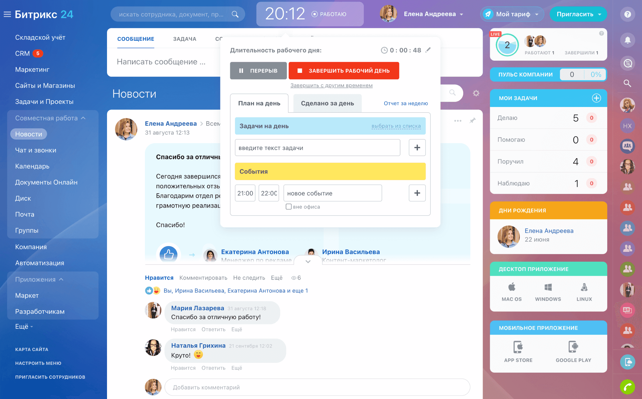 | Совместная работа, календарь, соцсеть, лента, мессенджер | ✓ | ✓ | ✓ | ✓ | ✓ |