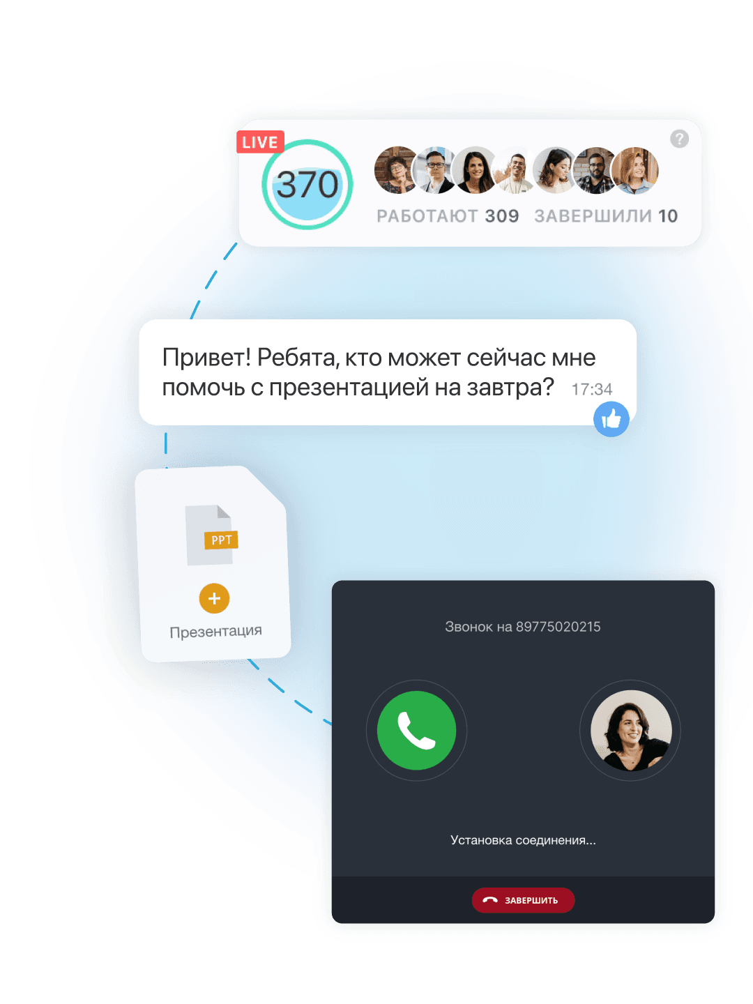 Коллеги, клиенты и подрядчики на связи — с высоким качеством видео и аудио, стабильным соединением и поддержкой групповых звонков до 48 человек. Звонок легко начать прямо из задачи, события в календаре или поста в Новостях компании.